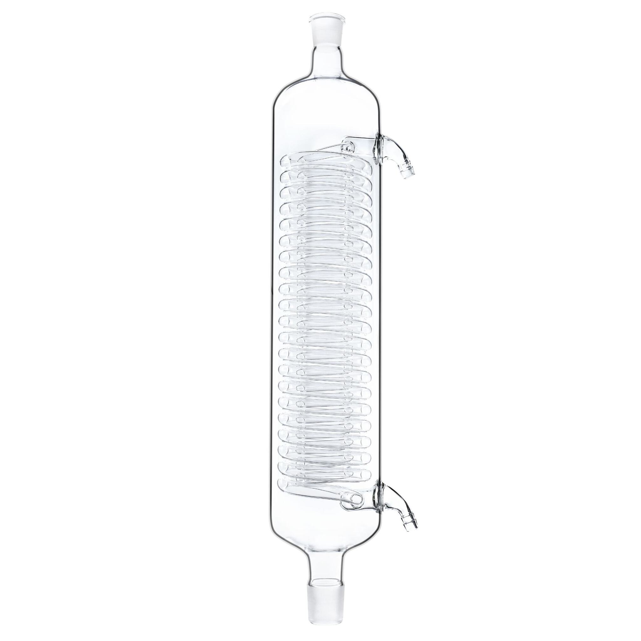 Изделие изготовлено из специального лабораторного стекла, обладающего повышенной теплоемкостью, превышающей показатели любого металла. За счет данной характеристики, стеклянный холодильник небольшого размера будет эффективнее любого холодильника из металла. Холодильник можно вставить в любую колбу с соответствующим шлифом для прямого слива вещества в другую тару без применения шланга.